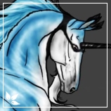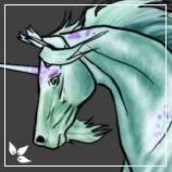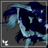 Fades from a pale sage along her topline to a darker sage green and then to crystalline blue from her cannon down to her hooves. She has three pale blue blankets one on her rump, another on her withers and the last the topside of her head that reaches a little down her neck, within these blankets are lavender appaloosa spottings. Her mane and tassels tale are pale ocean blue interrupted by her blanket colour, her featherings are coloured the same as her legs and her beard and ear tassels are a pale sage. Her hooves are a crystalline blue as well as her horn which is interrupted by lavender spider webbing at the base, her eyes are moss green.
