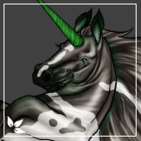 Description: Tall and powerfully built, he was much strength hidden within him. He is very handsome upon the eyes. His coat is of a dark grey with green dun markings and is touched lightly with a green/grey upon his tender areas and knee caps and hocks, with his points and barring ending in a darker green/grey. He has white tobiano markings and a broken up stripe upon his face. His mane is green/grey at the base that then lightens into a paler grey to his coat, it is broken up by the white of his markings. His tail is much the same, his beard being a darker green/grey and his featherings the same colour as his legs. His eyes are bright moss, his horn moss and his hooves a dark green/grey with a sheen.