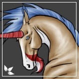 Description: Mainly a crimson red with dark grey appaloosa spottings along her topline with a paint marking that stretches from her muzzle along her throat, cheek, bottom side of her neck to her chest and then down the outside of her forlegs where some of it spills on the inside, but makes it look as if the inside of her forlegs only has stockings; her hindlegs have stockings in the same dark grey. Her mane and tasselled tail are a darker crimson that start off as crimson red at the base and her ear tassels are a dark crimson. Her beard and featherings are the same grey as her markings, her hooves are a marbled black, her horn is black striped thinly with crimson and her eyes are sky blue.