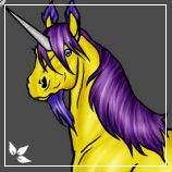 Description: Her body is a bright, sunny yellow, with dark grey stockings on both forelegs. Her mane and tail are a deep violet, her horn and hooves are pale silver. The feathering on her hindlegs match her coat color, but the feathering on her forelegs, her ear tassles, and her beard are all a dark indigo. She has a dark, jagged scar over her right eye, which is blood red and blind, contrasting sharply with her left eye, which is whole and dusty blue. She is on the smallish side, and gives the impression of being sickly, even when well.