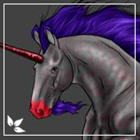 Description: Ces is a steel gray, fading into bright ruby on her lower legs, muzzle, and tail. The ruby on her back legs begins on her belly, then runs down the fronts of her hindlegs to her uneven socks. Her mane, tail, beard, and ear tassels are all a dark purple, and her hooves are a dark gray. Her eyes are a pale red, and her horn is scarlet. The top portion of her horn is broken off jaggedly. She is small and lithe, built for running, and covered all over in ruby dapples.