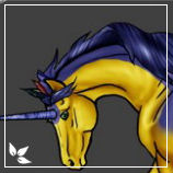 Description: His main color is a cobalt blue, splattered all over with large splotches of black, with one covering his muzzle and left eye. His mane, tail, beard, and ear tassles are all a deep amber color, while socks of lighter yellow adorn his legs. The sock on his right hind is interupted by a shorter sock of black, and that hoof is black as well while the other three are sand-colored. About half his right ear is missing, apparently bitten off many years ago. His eyes are a calm, clear violet, and his horn is a dark, metallic purple.