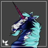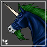 Description: Her main color is a midnight blue, with palest green dappling across her back and shoulders. Her color fades into silvery grey on her legs and muzzle. Her mane, tail, and beard are a darker green. Her hooves are gunmetal grey, and her horn is ivory. She has a faint lightning bolt shaped birthmark on her left foreleg, right above the knee. Her eyes are pale gold. She is on the smallish side, but lean and quick.