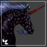 Description:Grace looks like his name, or so he likes to think. He's still growing, but will end up a tad on the short side. To make up for this, he has a broad chest and thick neck which lends to his singing ability. He's mostly a midnight blue that lightens at his points. His hind hooves have white cornet bands, while his forelegs have tall, tapering stockings. He has an irregular belly spot, also in white, as well as a broken spot on his neck and a half white face, marred only by a spot beneath his eye and one on his lip. His eyes are a bright yellow that stand out starkly against his half-and-half face, as does the maroon horn sprouting from his brow. His tail tassel, mane, ear tufts, and sparse beard are all a sea-blue-green color that seems to move like water against his coat. His hooves are the same blue as his coat.