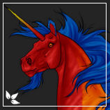 Description:Azor is a well-built young man. He is lean and full of muscle and strength. His pelt is a bright red at the head that fades to white then black towards the rump. His front legs have crimson socks while his hind legs have white socks. His front hooves are deep crimson while his hind ones are tan. His face has a white stripe on the chin and on the nose. His tail is crimson and black while his mane is copper. His eyes and horn are also the same copper of his mane.