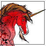 Description: : Navaho is a roan stallion. His color starts as a deep crimson at the top of his back and neckline then fades to red orange then pink before turning into white just above the knees. A similar thing happens at his tail tip. He has a bald face broken only by a red diamond shape across his eye. This occurs on both sides. He also has a snip in the rough shape of an arrow head. His mane and tail are black as well as his horn and three of his hooves. The front left hoof is red. His eyes are black.