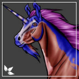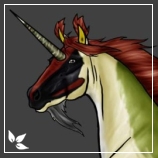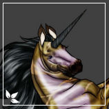 Description:Kinfe is a rather well muscled, compact stallion. His chest is rather broad and his haunches powerful, allowing him to reach high speeds quickly and turn easily. His head is rather rounded and fine and he is overall a rather generically bodied stallion. As for coloration Kinfe is a deep russet brown through his entire body except for his chest and cheek which are white. Between the russet and white lies a few violet mahogany lines that break up the solid cut between the two other colors. The stallion’s face has a peculiar blaze upon it which wraps around his lips from his chin then up to the base of his horn. Two triangular shapes protrude from this white line creating what sort of looks like wings and a tail of a great bird from the side. Kinfe’s tail is a bright orange with dark brown streaks while his mane is a dull brown with darker brown tips. His mane he keeps short like that of a Da’s by rubbing it on trees. This is to keep his mane out of his way when battling. Kinfe’s beard is white with brown tips. His hooves and horn are both golden yellow with navy tips and his eyes are the same gold as these.