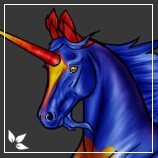 Description: Kokopelli is a medicine hat paint. His body is a midnight blue highlighted with twilight purple on his legs, stomach, and neck; his knees are midnight blue however. His mane and tail are also midnight blue, but his tail blends into yellow then red at the tip. His spots, one at his chest and one at his groin, are a mix of red and yellow. His face has a diamond pattern. The outer diamond is red, the inner yellow. The red part wraps around and over his ears. A diagonal pair of his hooves is midnight blue and the others are a mix of red and yellow. His horn is a gradient of crimson at the base to yellow at the top.