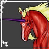 Description: Nuria is a flaxen chestnut. Her body is a deep crimson red accented by four white socks. The front two socks reach her knees and the back two not past her ankles; the left hind sock is longer than the right. All four socks fade into black before blending into the red of her coat. Nuria’s mane and tale tassel are a curly pale gold. Her hooves, horn, and eyes are all purple, though her hooves are darker than her horn and eyes. She is lithe because of her Desert dweller father.
