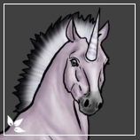 Description: Phantom is a pale storm purple, almost white. His stomach is white as well as his mane and tail. His mane and tail are tipped with black as well. He has a grey sock on his left hind leg that reaches just past his ankle. His muzzle is the same grey. His hooves are black and his horn is white with a pale purple pattern.
