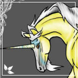 Description:: Razi is a golden palomino. Her body is a light yellow and her mane and tail tassel are both pure white. She has four white socks, each ringed with a neon blue stripe before blending into her yellow coat. Her face has a large white blaze which covers her muzzle and forehead. This too in surrounded by a neon blue stripe which runs over her eyes. Her hooves are white and her horn is a blend of yellow and neon blue.