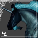 Description:Makan is a stormy blue in color. This color is only broken by a pattern of black spots on his rump. The most prominent of these spots is a rough tornado pattern surrounded by three large spots; these lie in a triangle pattern. His mane and tail tassel are white with alternating black and gray streaks. His horn is silver stripped with black and his hooves are black. His eyes are a stormy gray.