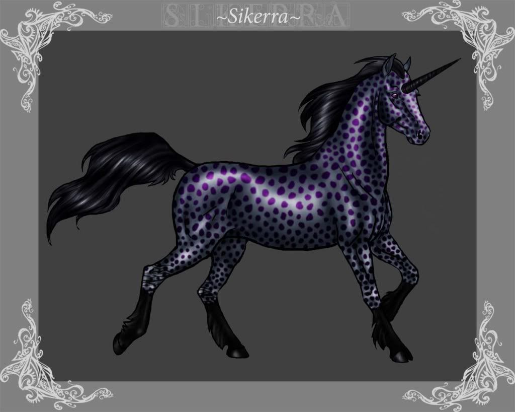 Description: Sikerra is a slender built Horse, dished face, large dark purple and blue eyes. Cloven hooves for front feet and full hooves for the hing feet. "Feathers" cascade down her hind leg and covers her feet. like any traditinal Unicorn, she has hair on the back of her front legs.