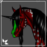 Description: Corm is slender built, with a slightly dished face. His coat is Deep red in color, with black dapples and half moon sliver lining on the dapples. He has a hunter green blaze that move over his face as if the wind blew it on. He also had hunter green socks on his front feet. His eyes are red and green. He has a beard. the hair on his feet stop at his hoof line. He has a black mane and tail. Corm's horn is black.