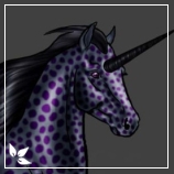 Her hair is normal lenght and just the slightest bit wavy. Deep purple spots over a Greyish blue, on the left side of her face the spots stop leaving the Greyish blue. over her nostrels the spots come back and cover the bottom half of the right side of her face. Her hooves are a jet black. Tiger stripes and socks are on her hind legs. Mane and Tail are Jet black with a Blue Metalic sheen, Her coat also has the same Metalic Sheen.