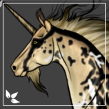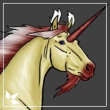 Description: Cream body with maroon extensive "bloody-shoulder" markings across his shoulders with a 4 smaller, separate patches on his body - on his near side he has one at the base of his neck and two below his croup, on his off side he has one on his gaskin. Mane, tail tassel, feathers all begin maroon and change to an off-white tinted with pale blue. Ear tassels are white. Muzzle, hooves and horn are maroon. Eyes are a deep indigo/purple colour. He's got a build similar to a tall, fairly heavy thoroughbred.