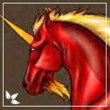 Description: Red with deep red pied. His mane and tail tassel are golden along with his horn and beard. He has golden amber eyes and his feathers are the same colour as his legs. His hooves are golden.