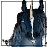 Once stable, she took her first few steps to find the nourishment that was her mother's warm milk. All the while she nursed, the silver dappled gray mare continued to groom the filly. A few small spots of white adorned the filly's dark body, among the drizzled silver. A white strip traveled from her horn bud down the tip of her muzzle. A ring of white, like eyeliner, outlined the eye on the filly's right side. But the base color of her body would show itself better as she grew older. What now simply looked to be a dark blue that bordered on black would show to be a beautiful hue of blue that faded to shades of silver and white under her belly and neck. Three feet would boast stockings that eventually danced up to meet the blue tones of her legs.