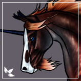 Description: A fiery chestnut roan with a white blanket on her haunches. Her mane and tail are of an orangey color, fading to cream at the ends, as does her beard. Her head and legs are a deep rust in color, with creamy feathering. Her eyes are emerald green, while her horn is cream at the base, gradating into crimson red at the tip.