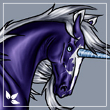 Description: Deep midnight purple, with a slight blue sheen. Silver mane and tail tassel, as well as jagged stockings on all four feet. A ragged silver blaze adorns her face, matched by silver appoloosa markings, all of which are rather angular. Bright, sky-blue eyes.