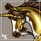 Description: Thi is something akin to a yellow dun paint in base color, showing primitive markings where her spots are. Her mane and tail are a chocolaty brown color as is her muzzle. She has three stockings or socks on all her feet save the left fore, which is white. The socks are yellow, ringed with brown at the top. She has blue eyes, a bronze horn, and a white ÔchevronÕ of sorts on her face formed by a patch of white counterspace.