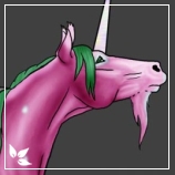 Description:She is an inverted dun that fades from magenta down to a pale pearl pink and then to an opal. She has an opal broken stripe ending in a snip that stretches right down to her chin and opal eye patches, a few white bird catcher spots scattered around her neck, withers and barrel. Her mane and tail are emerald and her featherings and beard a pale pink, her beard is broken by white as the snip runs into it. Her horn and hooves are opal and eyes are emerald.