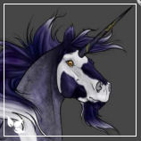 Description: She is rather slim-lined and petite with a deep purple appaloosa body, mainly spotted with white and hints of peach, she has a blue/purple mane, tail, featherings, beard and ear-tips. Her eyes are ice blue, horn silver as are her hooves all except her left hind which has a peach cornet and a tan hoof.